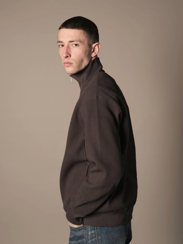 古い編み立て機を使用して編み上げた肉厚のローゲージワッフル地を使ったフルジップ仕様のカーディガン。