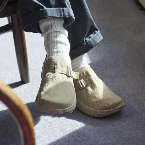アッパーのヴィーガン・スエードはクラレ社のクラリーノを採用し、本革よりも耐久性や水汚れに強く気にすることなくデイリーユースにできるアイ テムです。