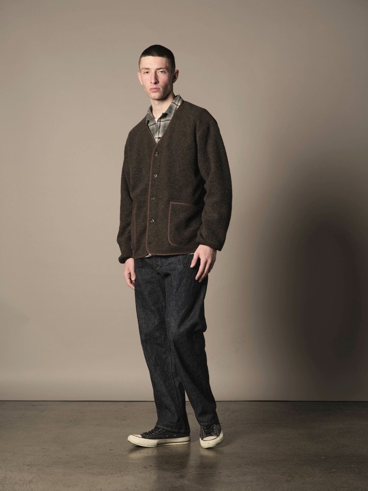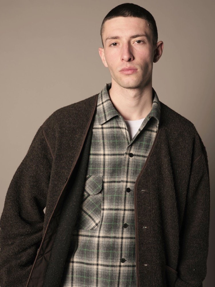 素材はリサイクルウールに圧縮を掛けて、うねりのある表面感を出したウールリングパイル地を使用。