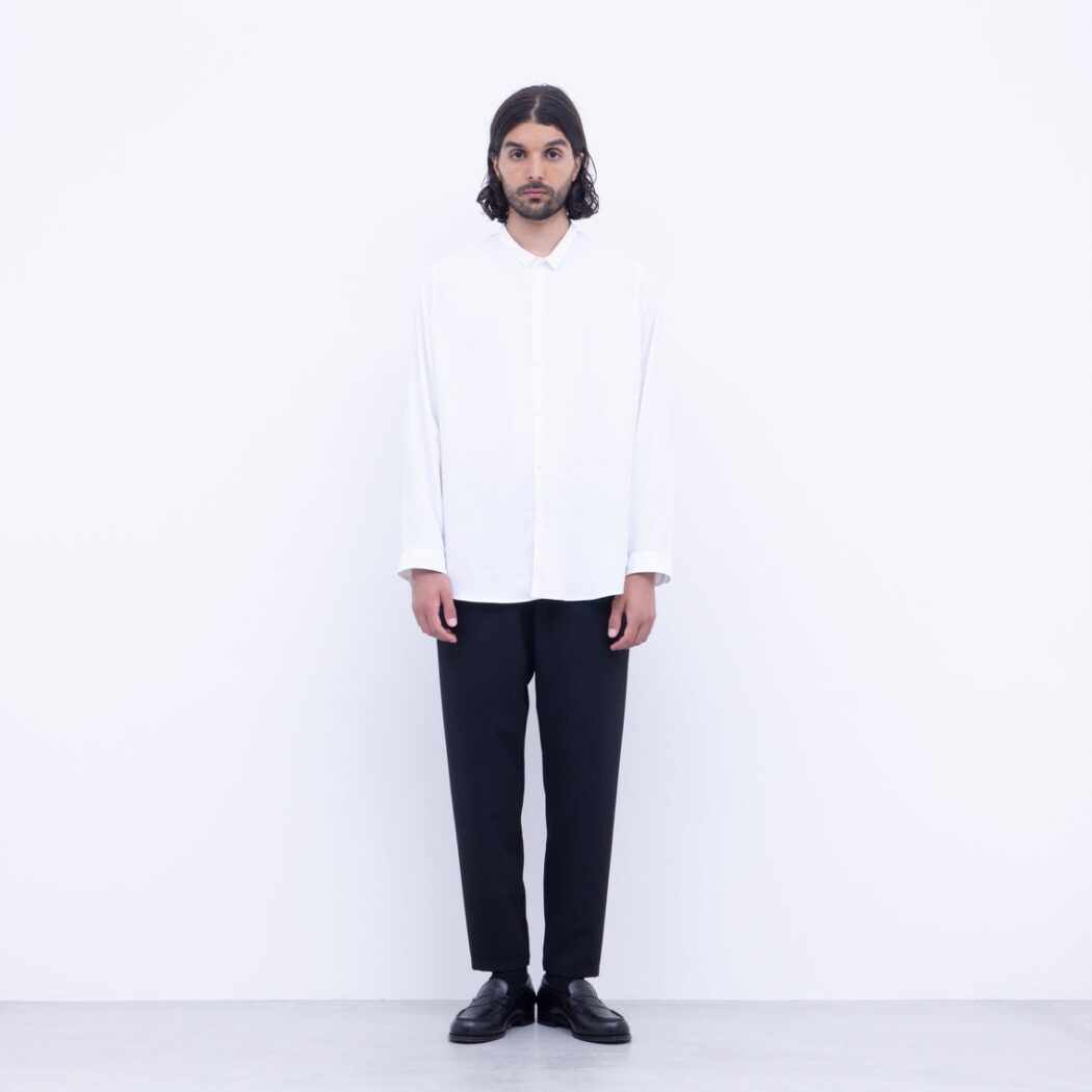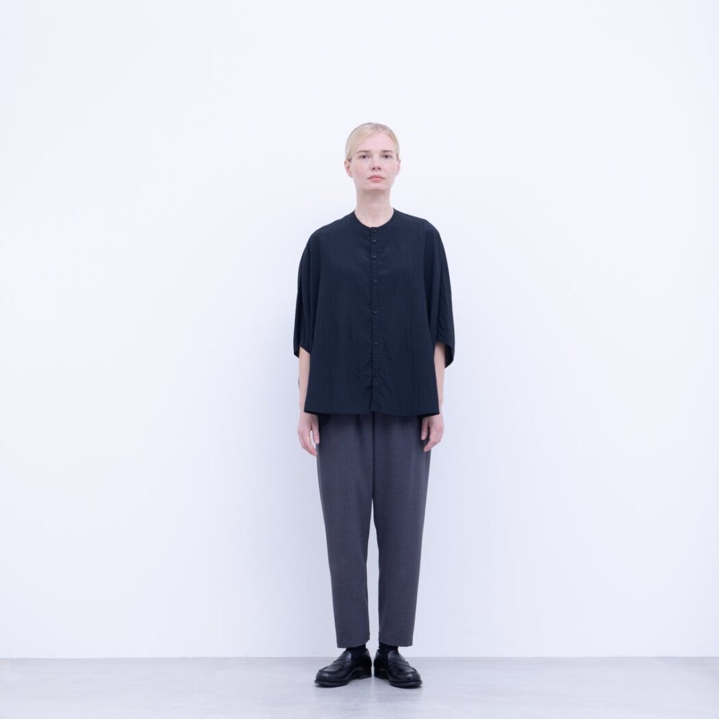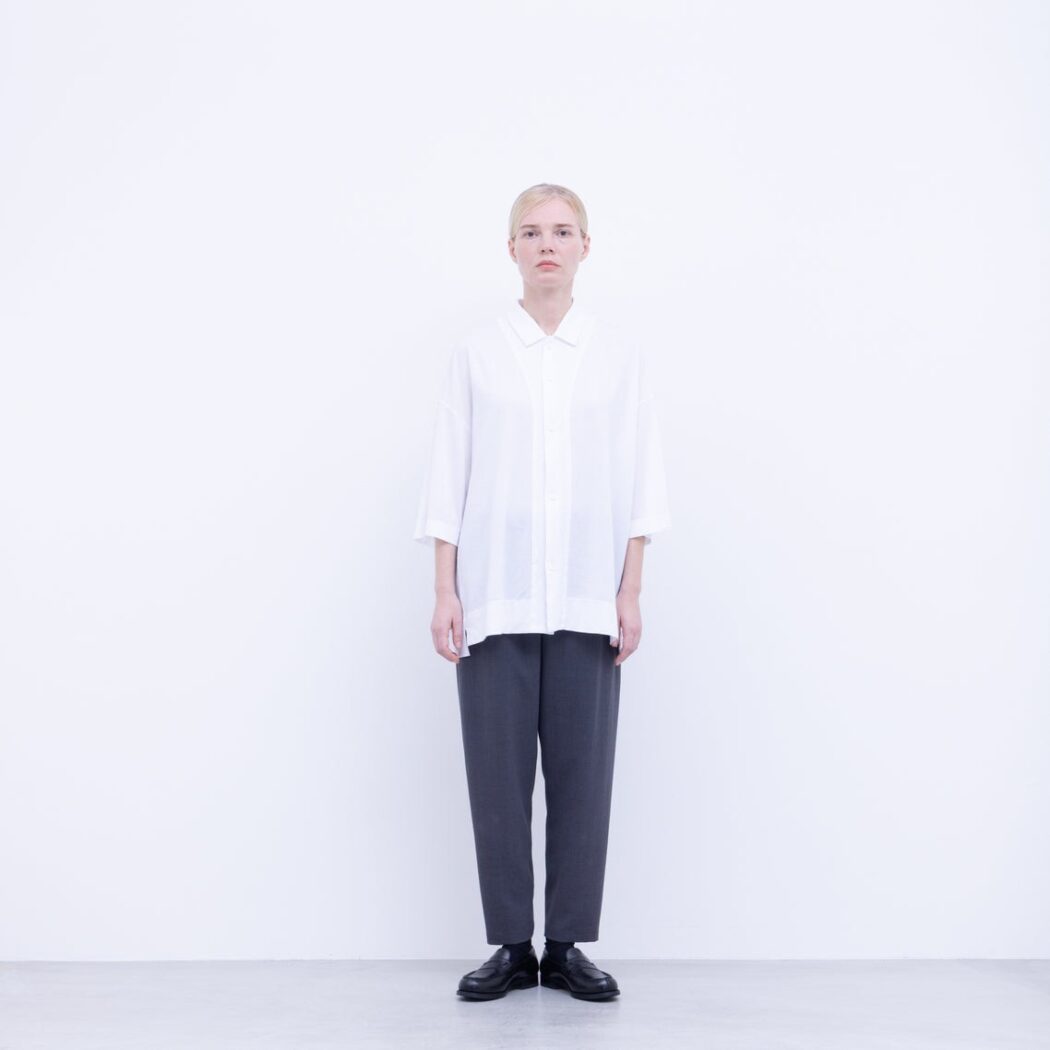 強撚としてはシャリ感も少なく、ナチュラル感を出すSY加工をいれることで落ち感と膨らみを足して、 程よく柔らかさを持ち合わせた生地に仕上げています。