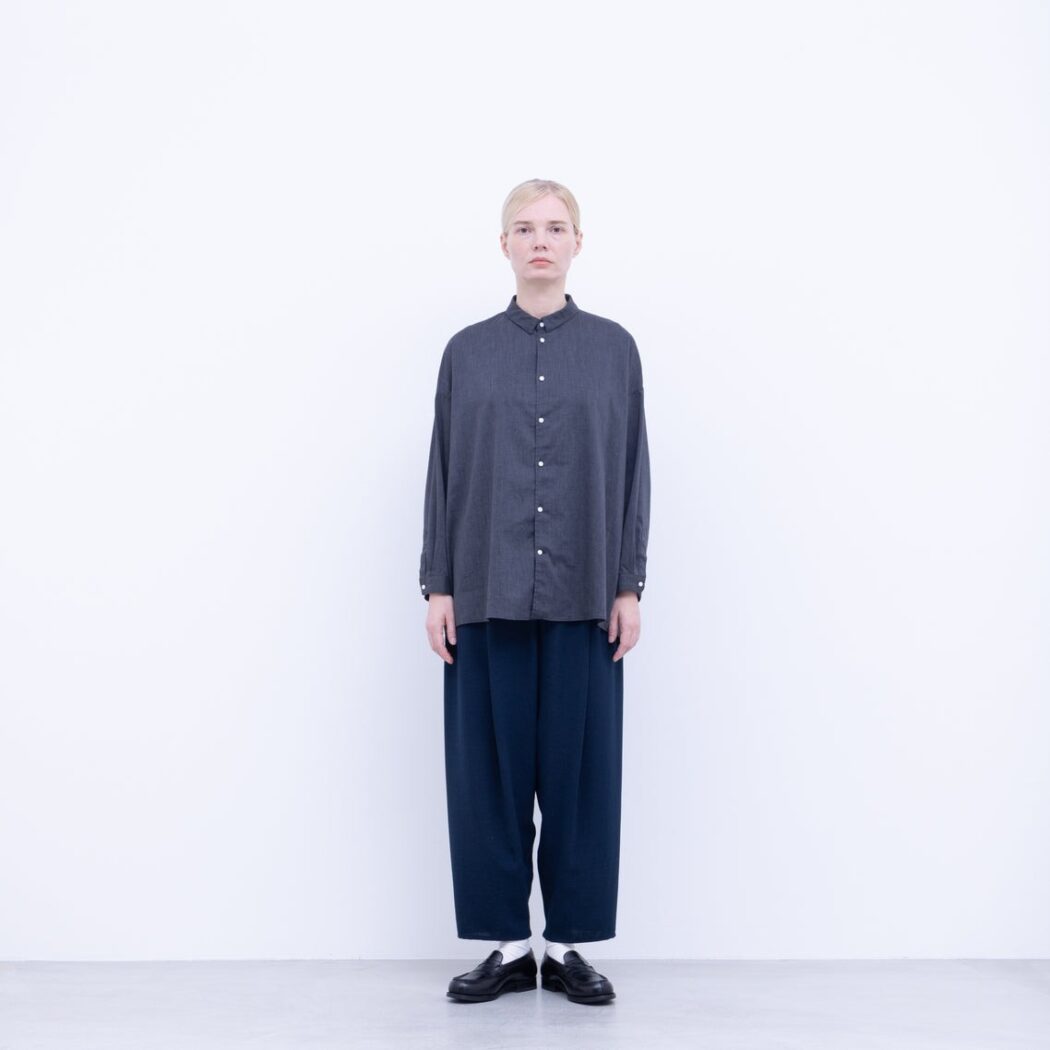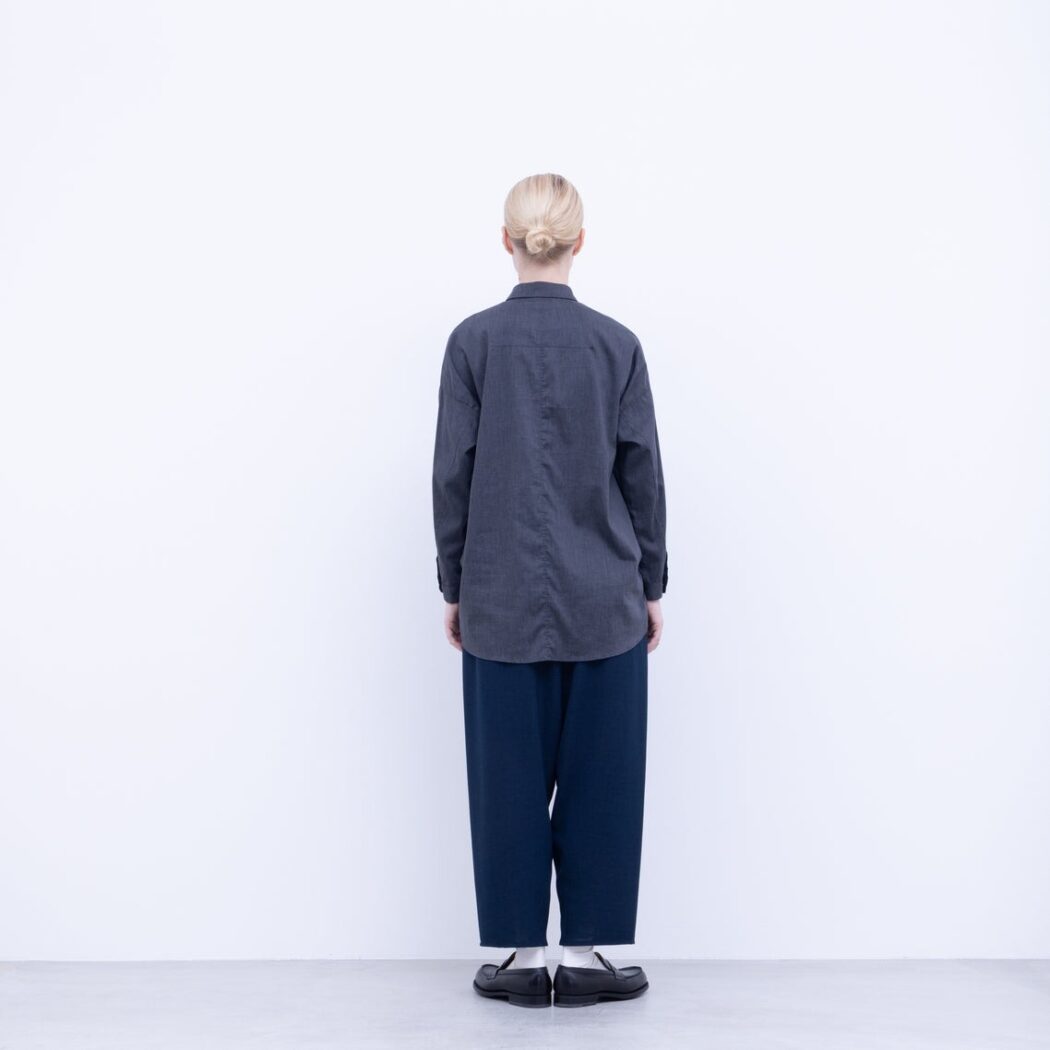 強撚としてはシャリ感も少なく、ナチュラル感を出すSY加工をいれることで落ち感と膨らみを足して、 程よく柔らかさを持ち合わせた生地に仕上げています。
