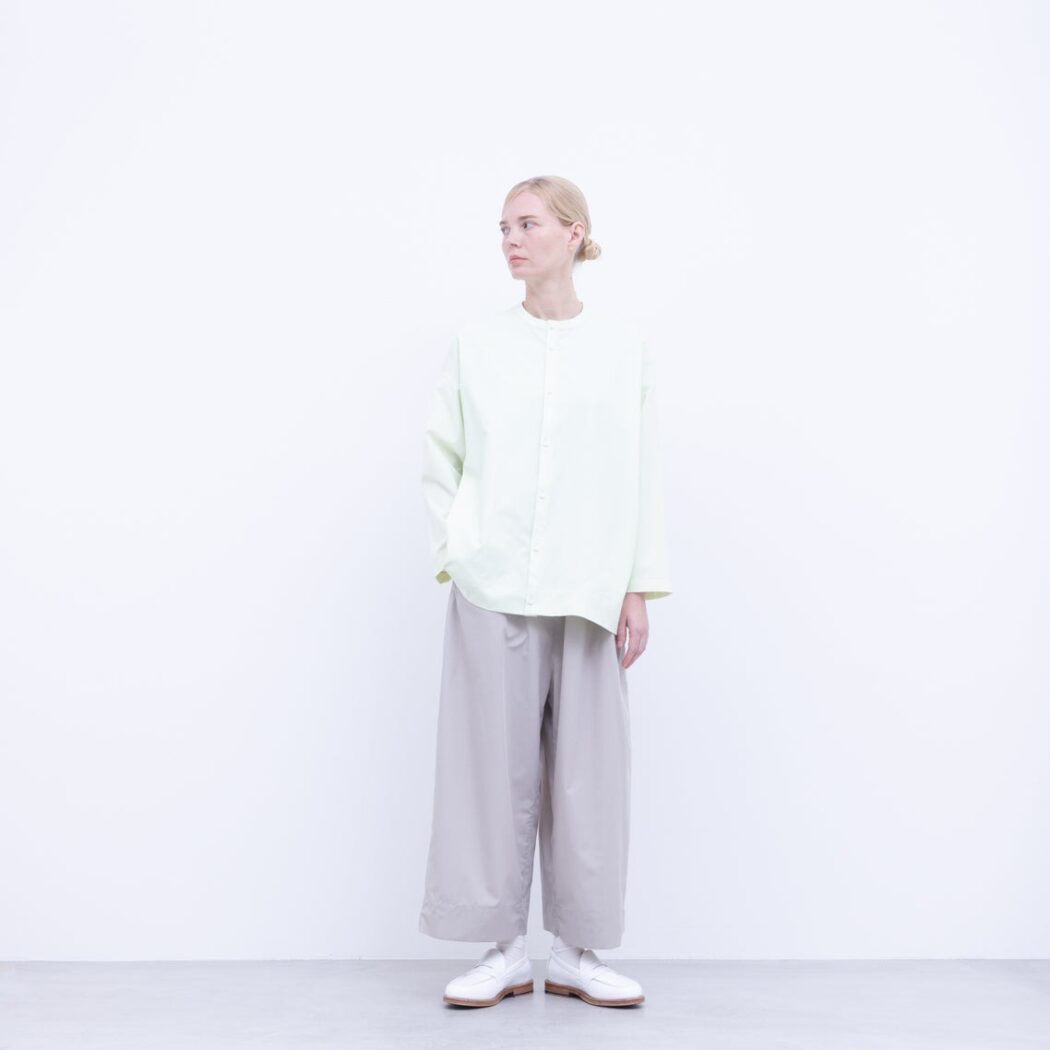 経糸緯糸共に50番単糸のポリエステルとレーヨンの混紡コンパクト糸を使用して平織で織ったブロード生地です。