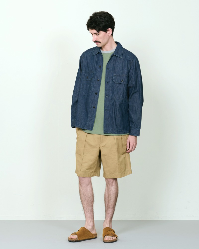 比翼仕様のフラップポケット、太巾のベルトループなど当時の仕様を参考にしつつ、素材の軽さを活かしたショーツです。